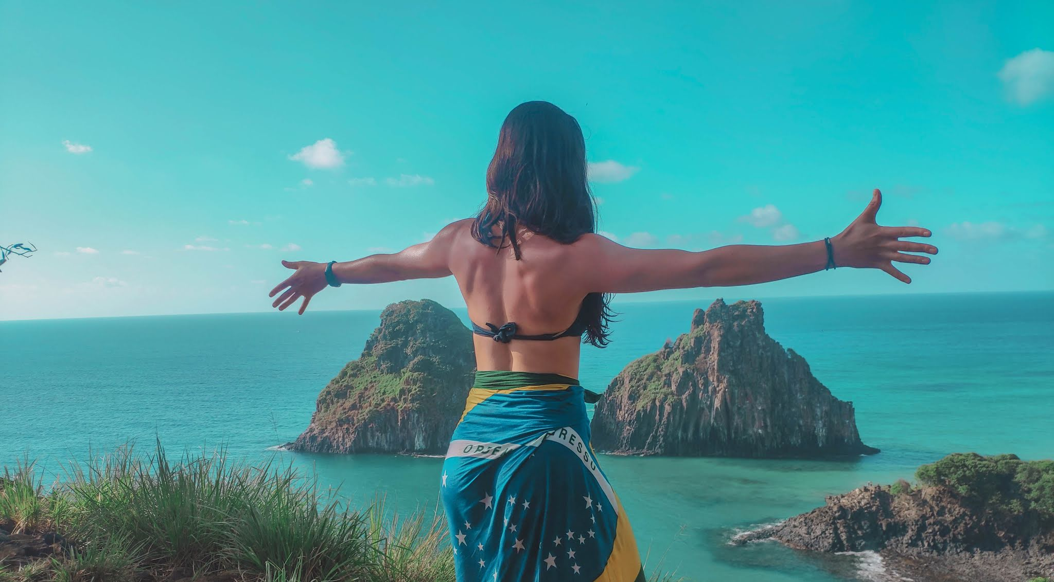 â–‡ Swimwear cover or light, bright clothing: spending the whole day under the sun can be dangerous to our skin. Applying sunscreen is one way to protect it, and covering our body with light clothing is another one. Swimwear covers are super popular in Noronha.